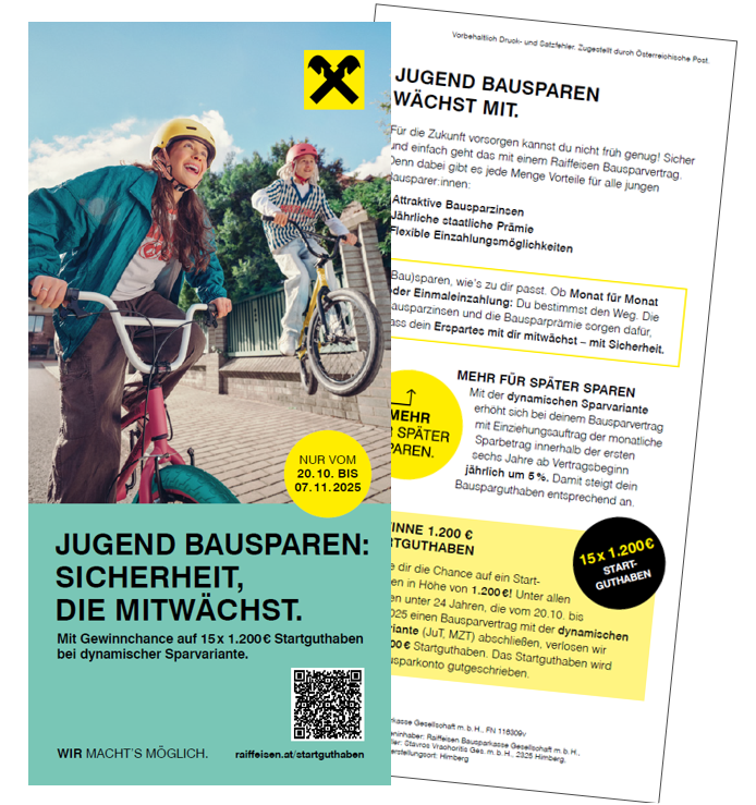Für Fragen zu dieser Kampagne steht Ihnen Herr Fabian Fritz, MA MBA– E-Mail: fabian.fritz@raibau.at, Tel.: +43 (1) 546 46-2819 –gerne zur Verfügung.